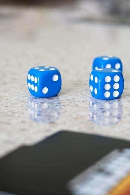 Conversely, bell-curve probabilities arise when multiple dice are added together, like rolling 2d6․ This creates a distribution where middle results are more frequent, forming a bell-shaped curve․ A roll of 7 with 2d6 is the most common outcome, while extreme values (2 or 12) are rarer․