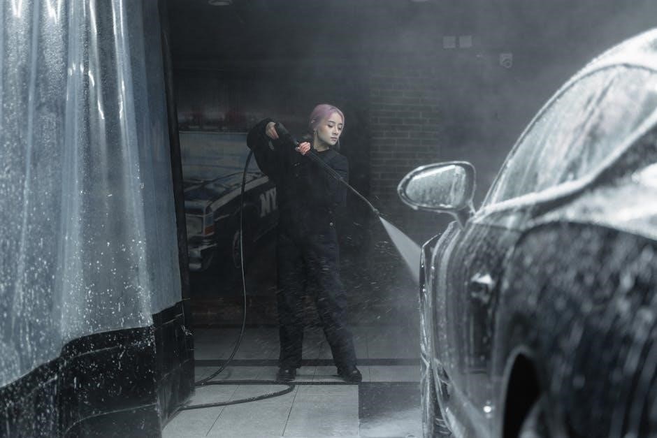 Inspect the high-pressure hose for any cracks or leaks‚ and clean the spray nozzles to ensure optimal performance. The manual advises against directing the spray back towards the unit during cleaning. Regular cleaning‚ as detailed in the manual‚ maintains the pressure washer’s efficiency and extends its operational life.